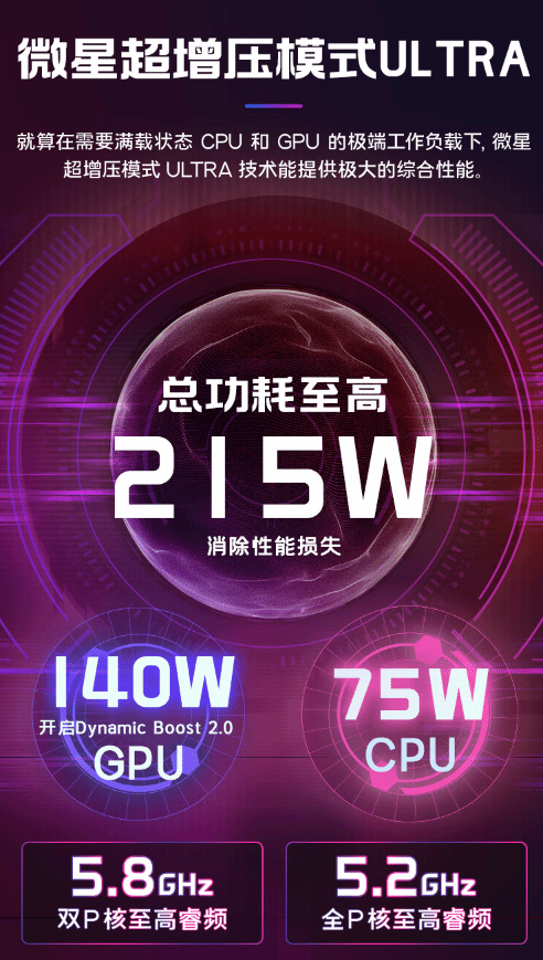 微星超增压模式ULTRA下,总功耗至高215W,开启Dynamic Boost 2.0可到达140W,CPU可达到75W。