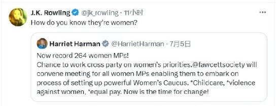J.K.罗琳看到她发的帖子以后,讽刺道:“你怎么知道她们都是女性?”
