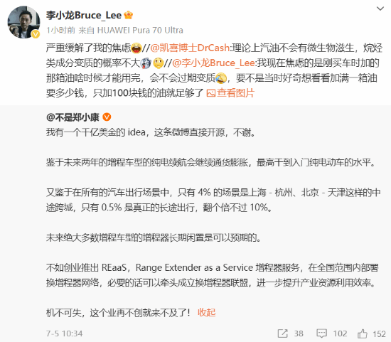 今日,华为终端BG CTO李小龙发微博力挺增程车:“增程车无论便宜多少钱我都不会把增程器卸下来。”