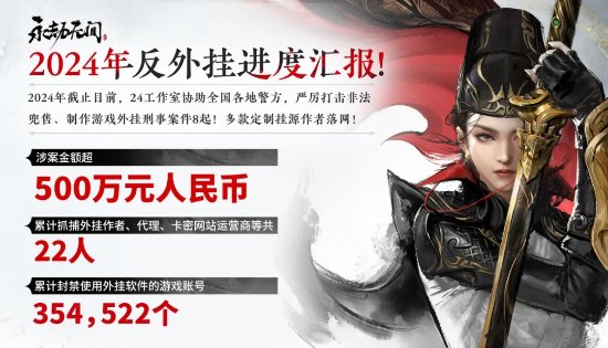 网易旗下武侠主题大逃杀游戏《永劫无间》在近日迎来三周年,官方在公众号向广大玩家通报了反工作的最新进度——今年截至目前,累计抓捕商22人,涉案金额超500万人民币,封禁354522个1账号。