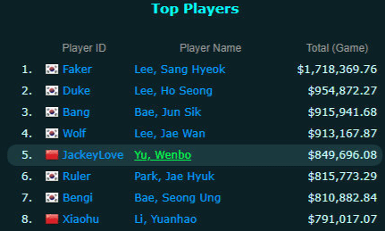 沙特杯后JackeyLove超越Ruler 来到LOL选手奖金榜第五名