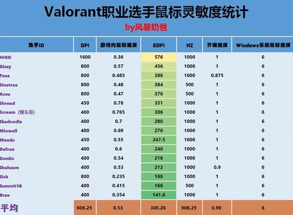 下面是无畏契约职业选手鼠标灵敏度一览: