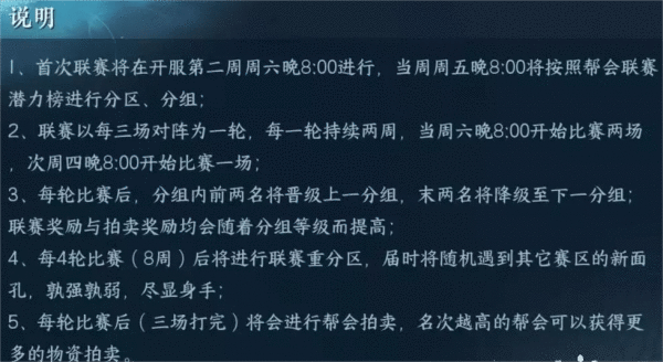 联赛时间:帮会联赛是双周的周六(20:00-21:00初赛、21:00-22:00复赛)单周的周四(20:00-21:00决赛)