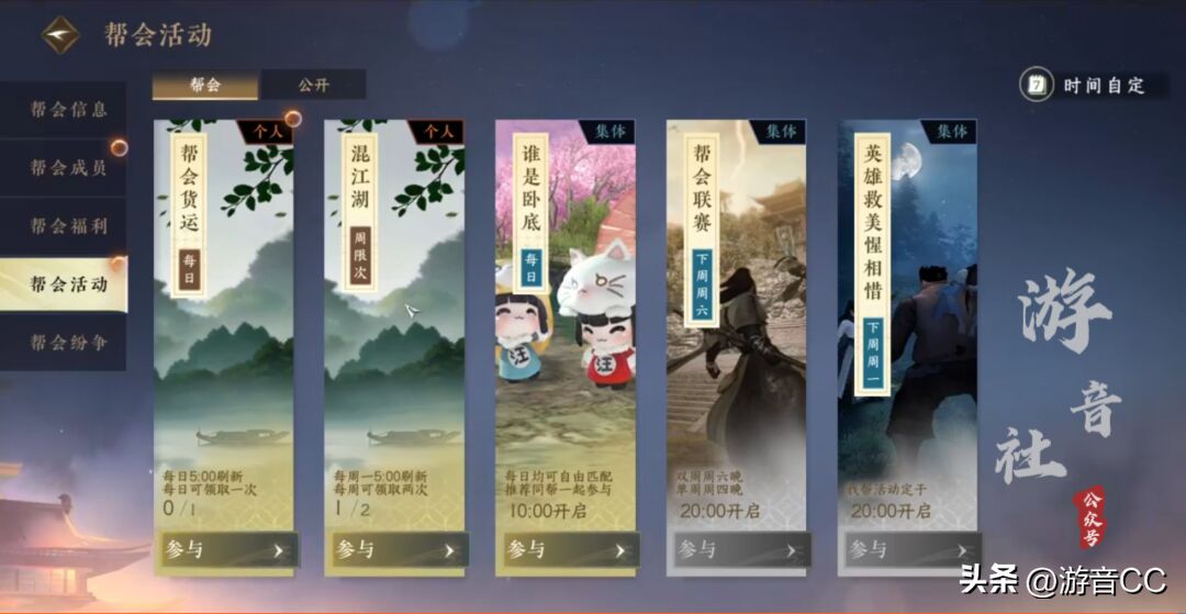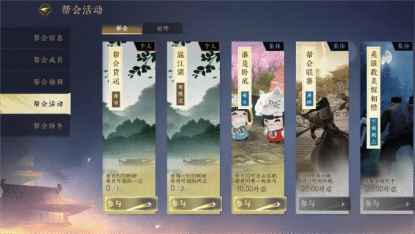 英雄救美惺相惜:每周可以参与一次,奖励为帮贡,交子等,可以由当家设置时间,前期建议为周一,等帮会等级稳定后,可以更改为其它时间