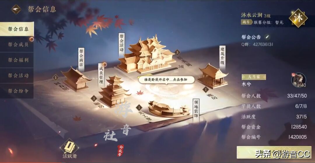活跃分红:根据每周帮会活跃贡献分配分红奖励(奖励还可以的,可以有好几万交子)