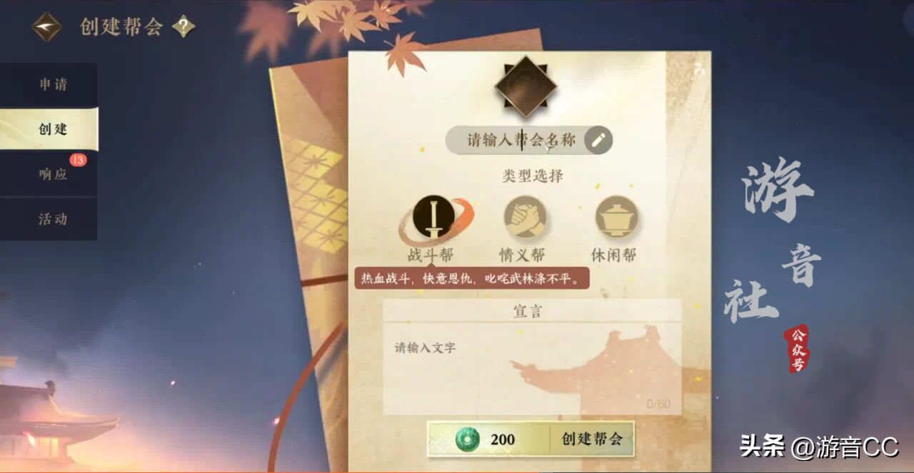 3. 确定帮会类型(不同的类型招募的玩家类型不同)