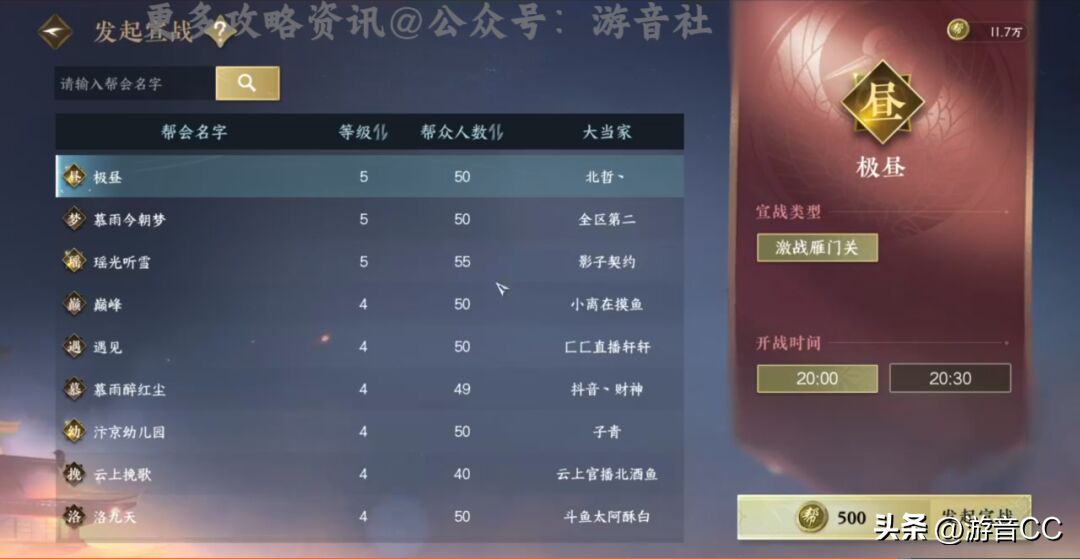 5.帮战于周五进行分组,在周六开战,分组将根据帮会潜力榜进行分组,帮会潜力榜为当前帮会内帮众的战力总和,在进行分组前完成战力的提升即可