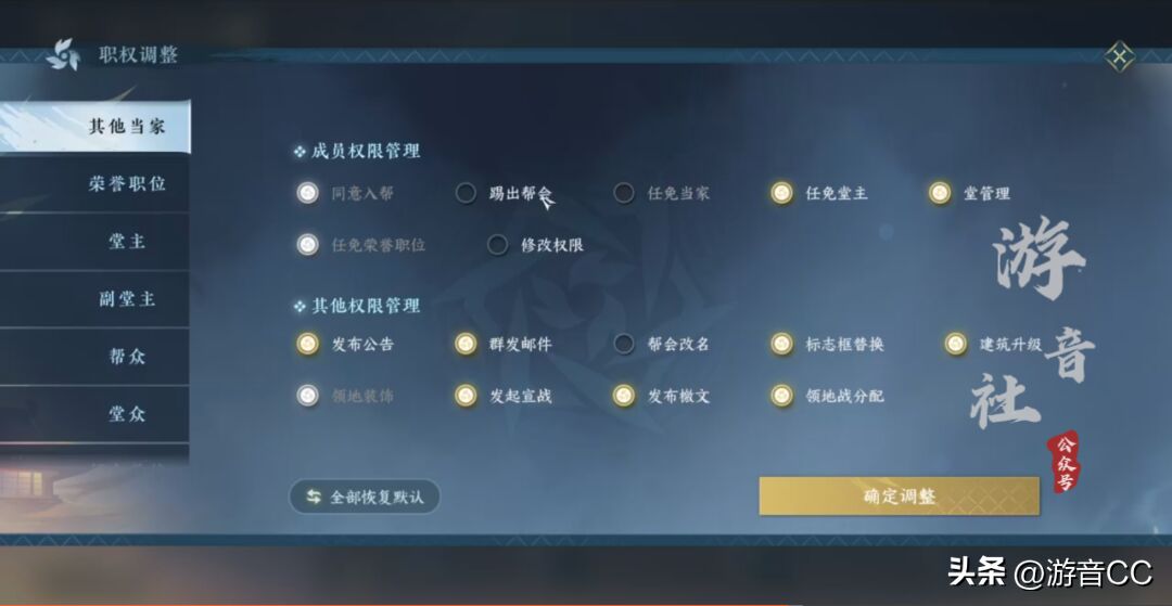 堂主:拥有固定权限:堂管理,以及其它需要大当家给予的权限若干