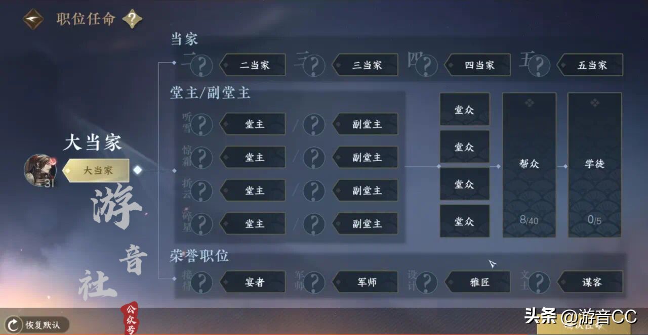 荣誉职位:分别具有不同的固定权限,大当家可以为其给予其它的帮会管理权限,协助当家管理
