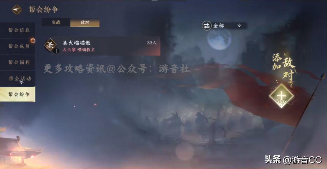 10. 敌对:可以根据自身帮会情况,添加或删除敌对,(根据端游的经验来说,拉敌对和删敌对是需要资金的,非必要不建议!)