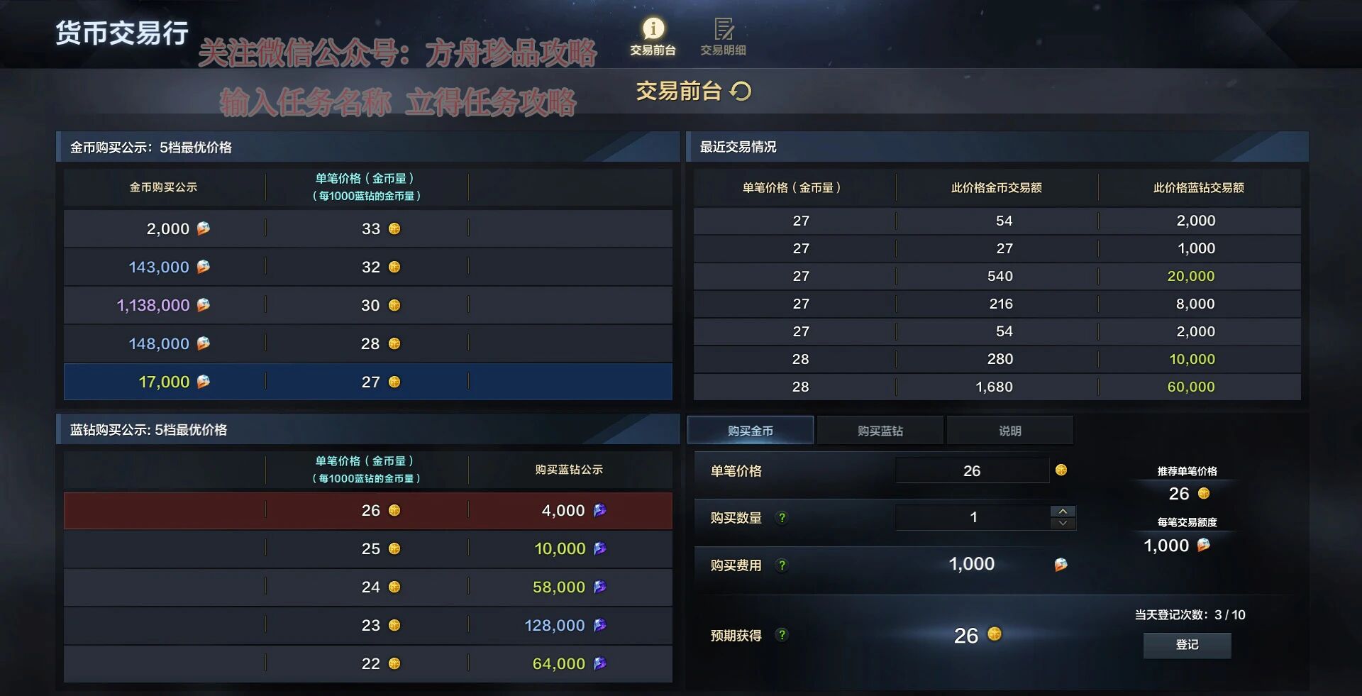货币交易所:使用蓝钻直接购买金币,每次单价购买所得的金币会产生浮动