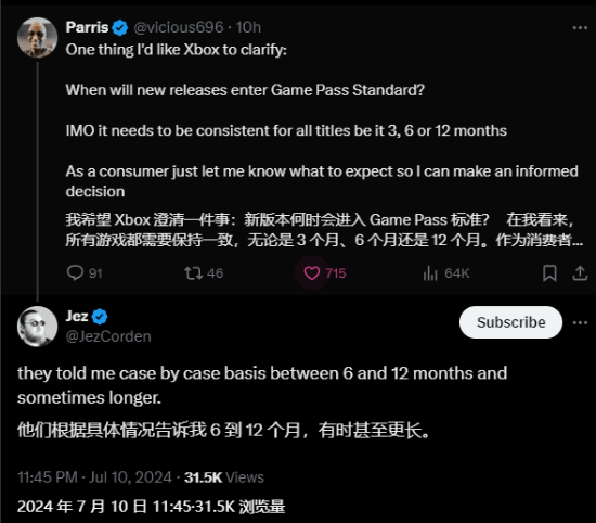 对于这个标准版能玩到第一方新作的具体日期,微软并未详细说明,很多玩家们也有这样的疑惑。对此,业内记者Jez Corden表示,他所了解到的情况是6到12个月或者更长时间后,第一方新作才会加入标准版Game Pass。