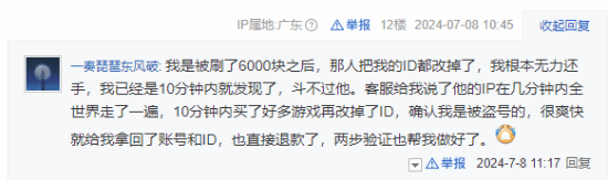 他表示自己半夜看了一眼手机,发现支付宝花呗消费了6000元,邮箱也收到邮件提示ID被更改。之后这个账号就被官方封禁,在联系港服客服之后,客服表示该账号的IP在几分钟内出现了多次变动,10分钟内就买了好多游戏,然后改了ID,确认他是被盗号的,然后帮助他找回了账号并退款。