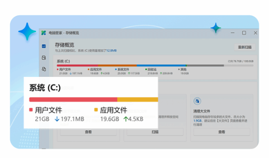 据介绍,磁盘分析功能可以帮助用户更好地了解电脑存储空间使用情况,通过磁盘分析,可以看到C盘中各类文件的占用情况,包括用户文件、应用文件、系统文件、回收站和其他文件。