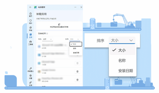 在3.12版本中,微软电脑管家也终于支持了卸载应用功能,用户可以根据应用大小、名称、安装时间进行排序查找,可以快速找到并卸载不需要的应用。