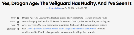 GameInformer副主编Wesley LeBlanc近期发布了一篇独家报道,透露《龙腾世纪4:影障守护者》将会有“裸露”的画面。