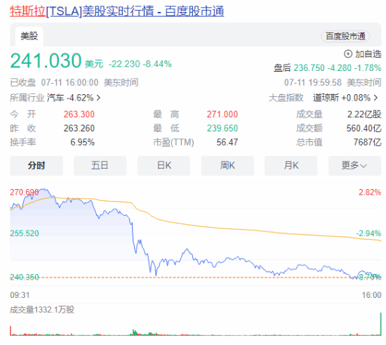 7月11日,美股开盘后特斯拉股价下跌5%,收盘时跌幅扩大至8.44%,终结11连涨,市值一夜蒸发709亿美元(约合人民币5146亿元)。这一跌幅也终结了特斯拉股价连续11天的上涨趋势,此前公司股价创下了自2023年6月以来的最长连涨记录。
