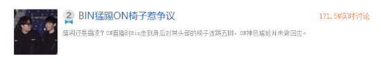 相关话题也登上了贴吧热搜引发网友热议。有网友吐槽称BIN连踹队友椅子五脚属实有些过分且不尊重人,俨然一副“霸凌队友”的样子,况且ON还开着直播,不管是不是开玩笑都让他很没面子。还有网友调侃BIN是国服第一青钢影。