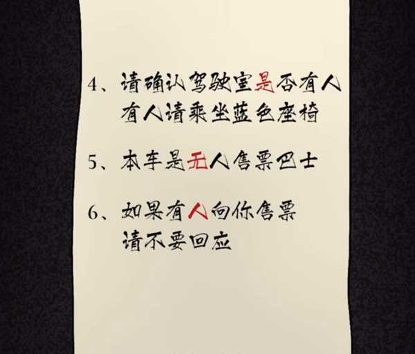 先看一下座位前的纸条,记住上面的规则。,然后去驾驶室查看是否有人。