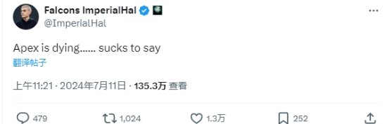 《APEX英雄》的著名职业选手/主播ImperialHal也发推直言:APEX快死了,引来一众玩家认同。