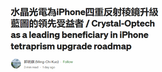 郭明錤表示很多投资者担忧苹果未来可能会采用塑胶棱镜来替代玻璃棱镜,不过其最新供应链调查显示苹果未来几年的 iPhone 产品将会继续采用玻璃棱镜。