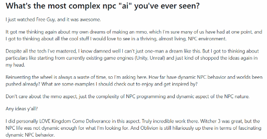 近日,一名玩家在Reddit论坛发起提问:“你认为哪款游戏NPC的AI最复杂?”并表示自己有一个制作MMO游戏的梦想,希望看到活生生的NPC出现在游戏里,想咨询一下玩家们的意见作为其设计参考。