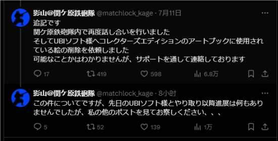 但“关原铁炮队”对于这样的道歉并不满意,推特用户@matchlock_kage 在另一篇帖子中提到:"关原铁炮队成员再次讨论了此事,目前已经要求育碧从典藏版画册中删除这张图片。”而育碧官方尚未对其做出回应。