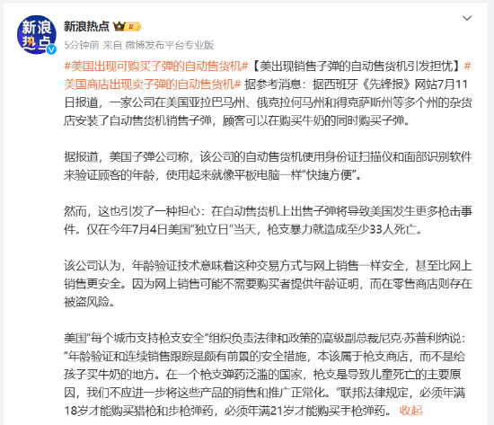 然而,这也引发了一种担心:在自动售货机上出售子弹将导致美国发生更多枪击事件。仅在今年7月4日美国“独立日”当天,枪支暴力就造成至少33人死亡。