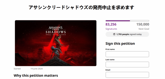 此前我们曾报道,有日本玩家在请愿网站change.org上发起了一项请愿活动,要求育碧取消发布《刺客信条:影》。原因是游戏有大量的内容和根本不与史实相符。继此前超7万人在请愿书上签名后,近日这一数字再创新高,且不断有上涨的趋势。