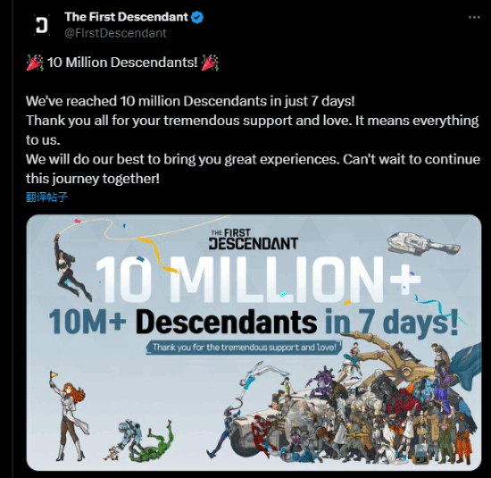 Nexon最新的第三人称射击网游《第一后裔》发售仅一周多时间,就已经取得了不小的成绩。该游戏的官方推特帐户宣布了最新里程碑:“仅用7天,我们的玩家数量就已达到1000万!感谢大家的大力支持和厚爱。这对我们来说意味非凡。我们将竭尽全力为您带来绝佳体验。迫不及待地想和您一起继续这段旅程!”