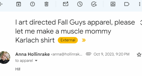 Anna Hollinrake在邮件的开头写道:“我曾为《糖豆人》的服装进行美术指导,请让我设计一个肌肉妈妈卡拉克的T恤。”这句话让她成功地获得了为该公司设计T恤的工作机会。