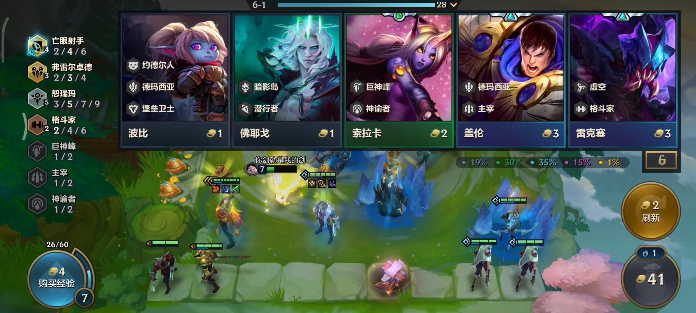 前排可以选择格斗家,毕竟,此阵容中的雷克顿就是格斗家。要是前期锁血不太顺利,六人口就可以小D一波了,最好是刷出阿克尚,6人口刷三费卡的概率有30%,与七人口相比,只差了5%而已。