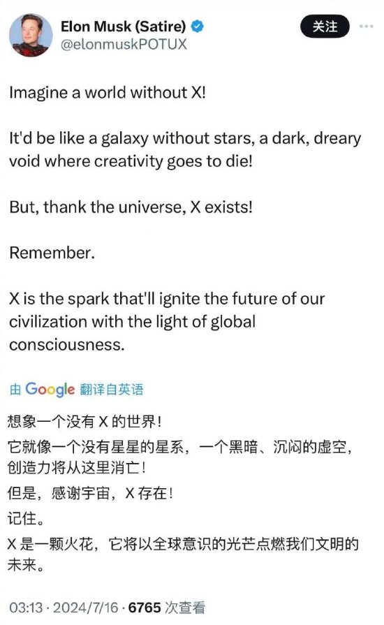随后马斯克又在这条X文下方激情赋诗,让大家“想象一个没有X的世界会是怎样?”并表示,X是一颗火花,它将以全球意识的光芒点燃我们文明的未来。