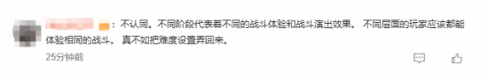 也有人表示不认同,觉得这样的机制很奇怪,“不同阶段代表着不同的战斗体验和战斗演出效果。不同层面的玩家应该都能体验相同的战斗。真不如把难度设置弄回来。”