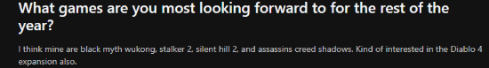 从年初爆火的《幻兽帕鲁》《地狱潜者2》,到动作、RPG大作《剑星》《最终幻想7重生》《龙之信条2》《如龙8》,今年上半年涌现出了不少优秀的游戏作品。近日,国外Reddit论坛网友热议起了下半年还有哪些游戏值得期待。其中,无数国内玩家翘首以盼的《黑神话:悟空》被提及,《潜行者2》《寂静岭2:重制版》等游戏也很受国外玩家欢迎。