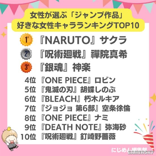 日站にじめん近日开了“JUMP作品”最喜欢的女性角色排行榜调查投票,分男女榜各选TOP10,可以预见的,老民工漫火影占了大多数噱头。