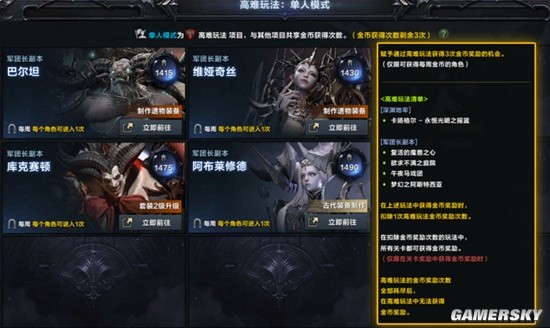 另一个贴心的改动,则是早在前瞻直播中就引发玩家们广泛讨论的“单人副本”。作为国服专属模式,玩家可以利用额外的加成效果,去挑战那些通常需要团队合作才能完成的普通难度“军团长副本”,并且能够获得与组队时相同的材料奖励。