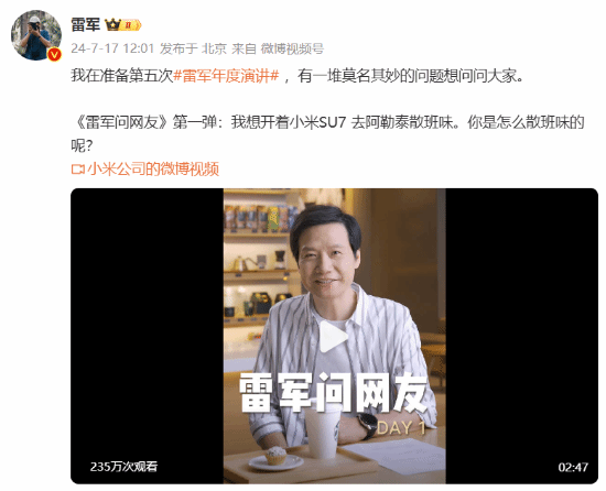 雷军称自己当时就是单纯的想感谢下车主,没有其他想法,但“在网上特别火。”因此他想询问下网友,让大家帮出出主意,如何再整整“泼天的流量”。