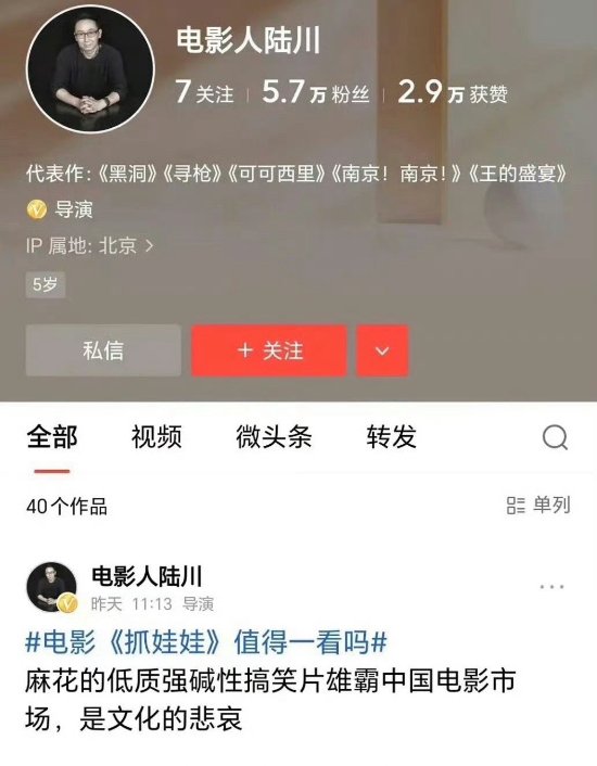 导演陆川的头条账号最近出现了狠批电影《抓娃娃》的内容,说“麻花的低质强碱性搞笑片雄霸中国电影市场,是文化的悲哀。 ”
