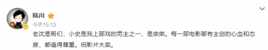 “老沈是哥们,小史是我上部戏的男主之一,是亲弟。每一部电影都有主创的心血和态度,都值得尊重。祝影片大卖。”