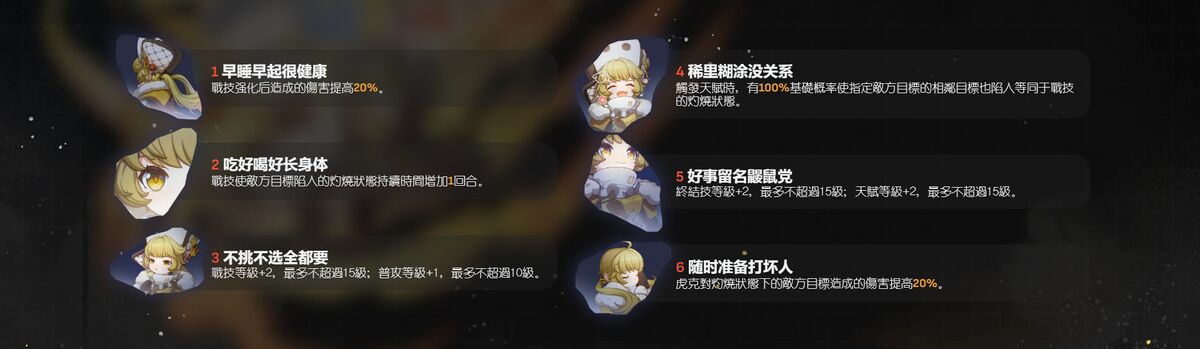 在米哈游的官方活动页面可以看出,接下来新出的角色都是没有火属性。所以虎克在打火属性弱点的BOSS时,会有非常好的发挥,再加上他本身的灵敏就很不错,还有可爱的造型,又好培养,所以对于平民玩家来说是非常推荐的。加上之前主线任务送的艾丝妲,她的行迹点“点燃”,可以提供全体火属性伤害的提高。所以虎克搭配艾丝妲的话,队伍伤害也是很不错的。