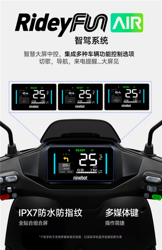 M95c依旧采用踏板样式,整体造型非常简约,拥有吉利银、沙漠黄、英伦绿、珍珠白、战斗黑、金刚灰六款配色可选,中控采用全贴合屏幕,支持 IPX7 级防水防指纹,集成多种车辆功能控制选项,并升级光感大灯,近光亮度达8500cd,相比前代提升超1.5倍,而远光亮度达25000cd,提升10%。