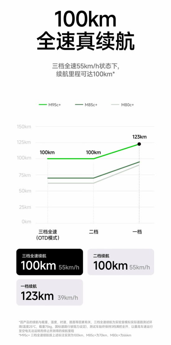 在一档39km/h下续航可达123km,三档55km/h全速续航达100km,满足日常代步使用需求。