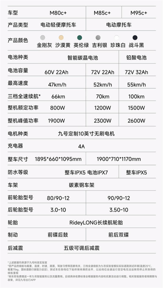 九号电动摩托车新品远航家M95c现已上架,号称三档全速续航100km,首发价5999元起。