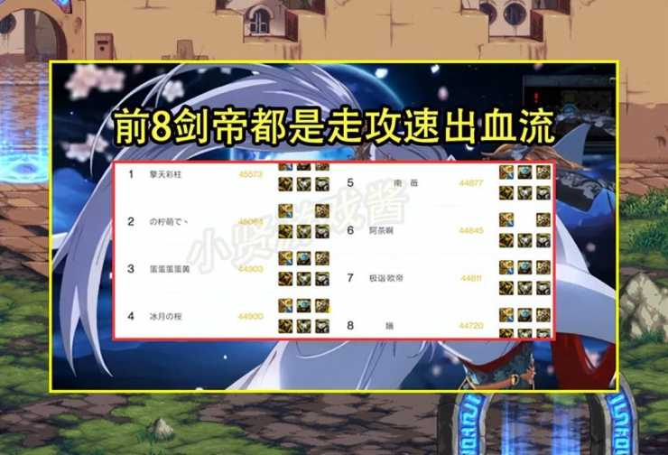 装备搭配方面,在排名前9的玩家中,前8名都是走的是攻速出血流搭配,只有第9剑帝走的是军团出血搭配,之所以会选择攻速出血流搭配,是因为剑帝和刺客、剑魂、剑影一样都是非常依赖攻速的职业,攻速高对于技能施放的速度、操作的手感有很大的提升,能体验到起飞的感觉,非常的舒服,这不是军团出血流那点提升能比的,比起伤害,玩家更在意速度。