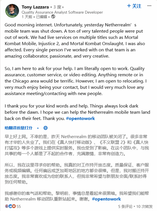 “早上好各位网友。不幸的是,昨天Netherrealm的移动团队被关闭了。很多非常有才华的人失业了。我们在《真人快打移动版》、《不义联盟 2》和《真人快打猛攻》等多个游戏上提供实时服务。我也因此受到了影响。在这个团队中,与我共事的每一个人都是了不起的合作者,充满激情,非常有创造力。”