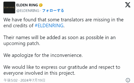 《老头环》开发者名单缺少部分翻译人员 官方发文致歉