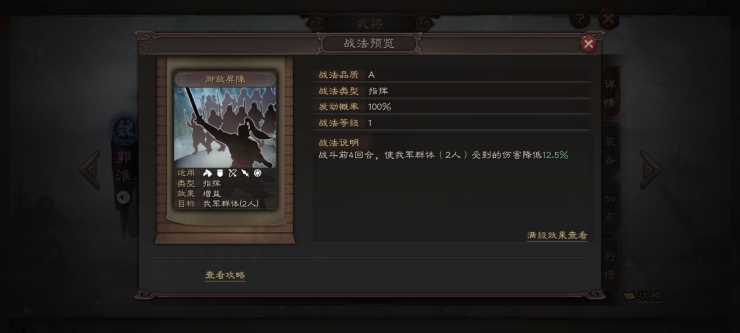 战斗前4回合,使我军群体( 2人)受到的兵刃伤害和谋略伤害降低12.5%- +25%