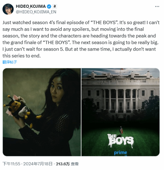 《黑袍纠察队》第四季最后一集现已上线,知名游戏制作人小岛秀夫发表了对本集的观后感,并表示自己已经等不及看第五季了。