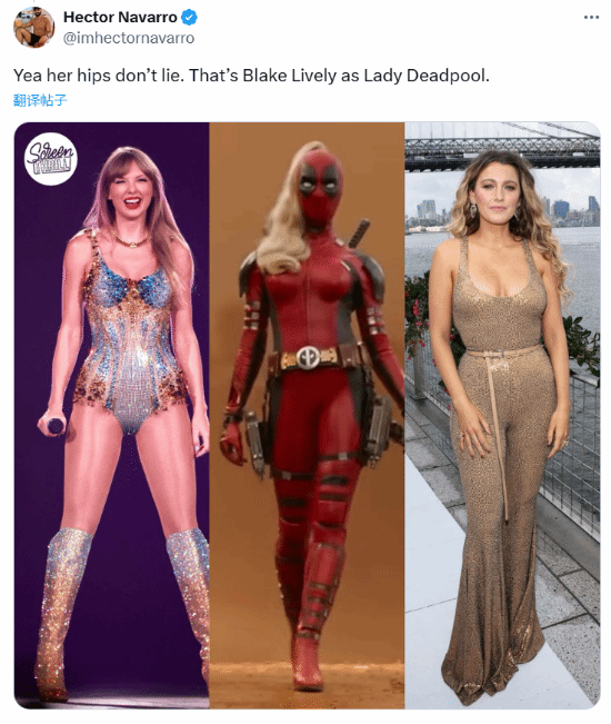 国外网友在惊喜之余,对于这位“女死侍”是由谁扮演的仍在议论纷纷。有网友还在泰勒·斯威夫特or布莱克·莱弗利之间犹豫:
